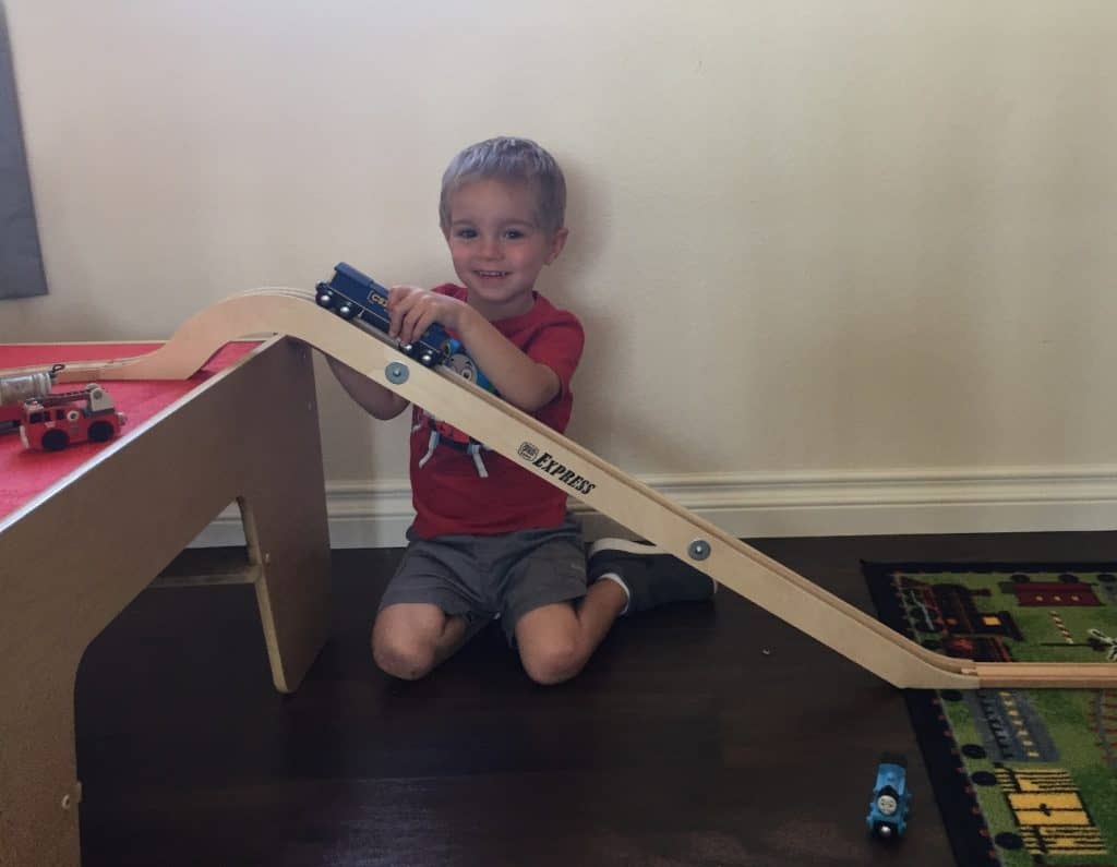 One of his favorite features is listening to the trains rumble as they coast down the track. Even battery trains are strong enough to pull a few cars to the top. He and his friends have spent many hours of fun playing on it!