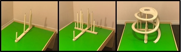 The table-top version is a single spiral that ascends 15 inches to a turn-around after which trains coast back down to where they started. It’s just as much fun as the original! Assembly of the table-top version is nearly identical to the original, two base pieces and the spiral. The only difference is that the track is attached to the columns with wood screws using nothing more than a screwdriver.