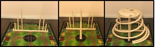 One of the most important features is how easy it is to assemble – it arrives in 3 pieces and requires no tools! Simply set up the base pieces (they nest into each other), then drape the spiral. Starting from the top, press the holes in the track onto the matching dowel pins in the top of each column. That’s it!